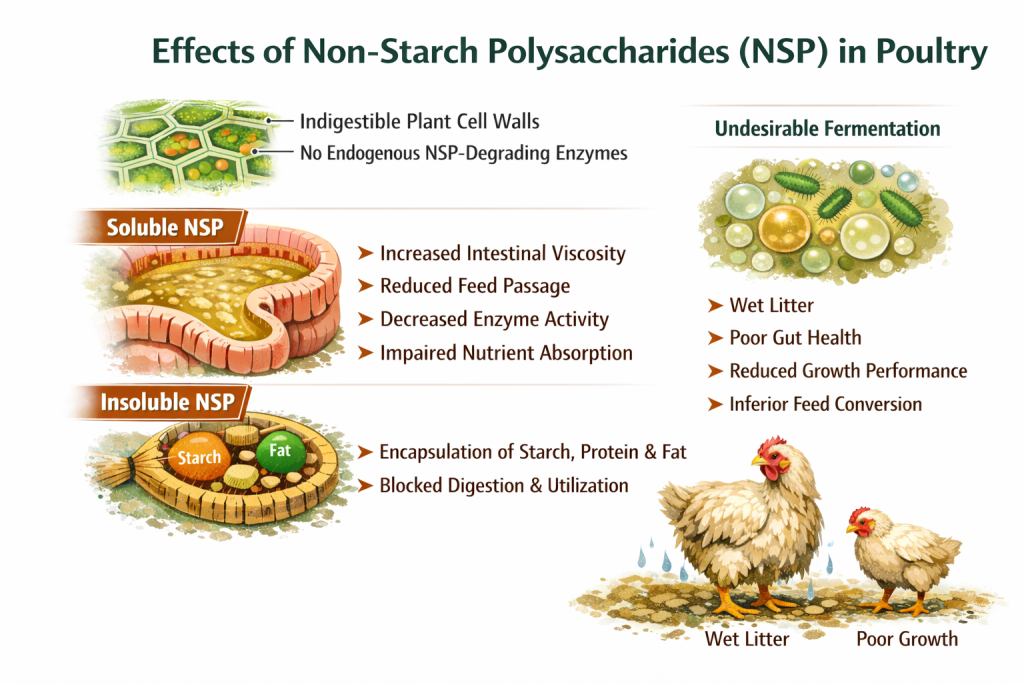 - NSP also promote undesirable microbial fermentation, leading to wet litter, poor gut health, reduced growth performance, and inferior feed conversion efficiency.