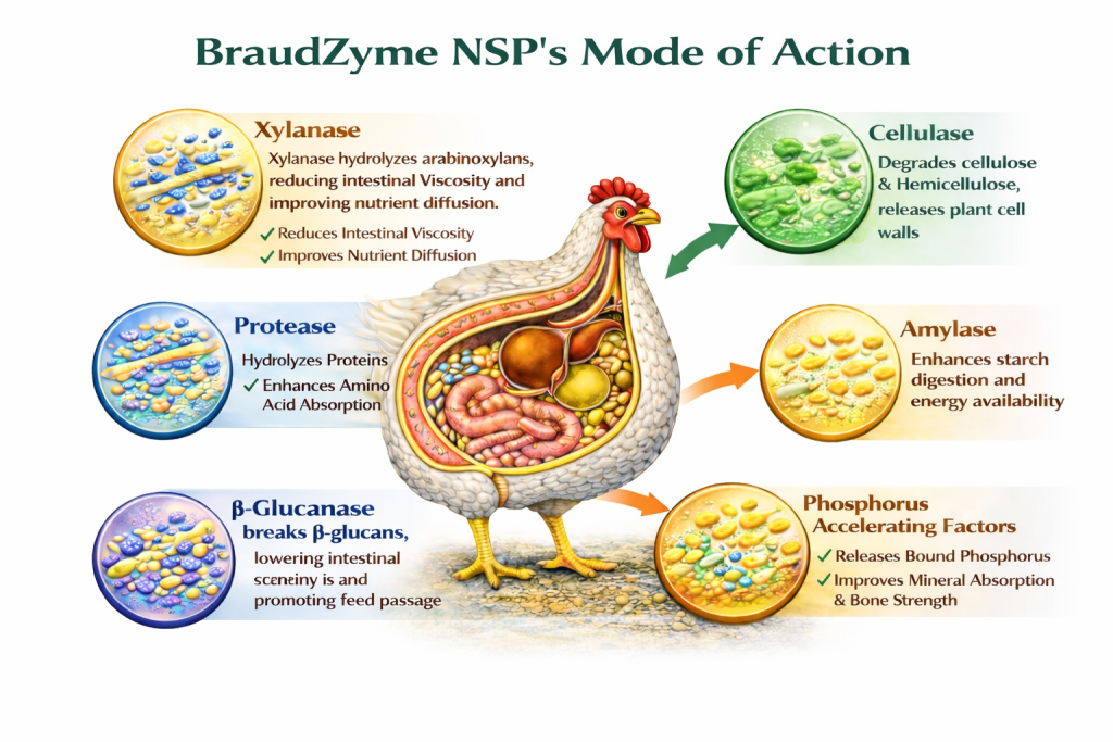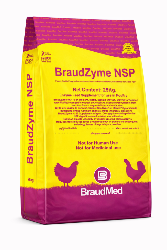 BraudZyme NSP is an advanced multi-enzyme feed supplement is formulated to combat the anti-nutritional effects of non-starch polysaccharides (NSPs) in poultry feed. It contains a synergistic blend of Xylanase, Cellulase, β-Glucanase, Amylase, Protease, and Phosphorus accelerating factors, ensuring enhanced nutrient availability, better digestion, and improved feed efficiency. Specially designed for broilers, layers, and breeders, this enzyme formulation optimizes performance even with high-fiber or variable-quality feed ingredients.